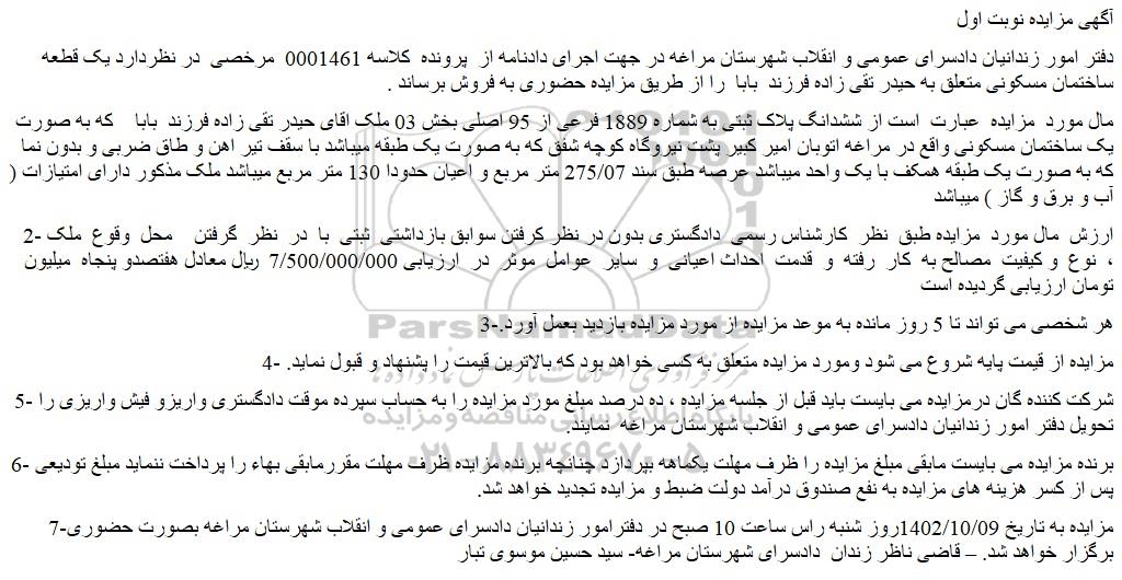 مال مورد مزایده عبارت است از ششدانگ پلاک ثبتی به شماره 1889 فرعی از 95 اصلی بخش 03 ملک اقای حیدر تقی زاده فرزند بابا که به صورت یک ساختمان مسکونی واقع در مراغه اتوبان امیر کبیر پشت نیروگاه کوچه شفق که به صورت یک طبقه میباشد با سقف تیر اهن و طاق ضربی و بدون نما که به صورت یک طبقه همکف با یک واحد میباشد عرصه طبق سند 275/07 متر مربع و اعیان حدودا 130 متر مربع میباشد ملک مذکور دارای امتیازات ( آب و برق و گاز ) میباشد