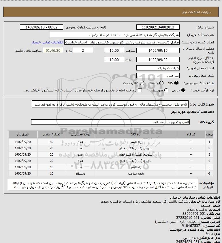 شرح کلی نیاز: تایمر طبق پیوست - پیشنهاد مالی و فنی پیوست گردد درغیر اینصورت هیچگونه ترتیب اثری داده نخواهد شد.