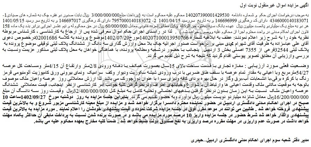 به موجب درخواست اجرای حکم و شماره دادنامه 140207390001429530 محکوم علیه محکوم است به {پرداخت مبلغ3/000/000/000 ریال بابت صدور دو فقره چک به شماره های صیادی1-4346000140183071 دارای کد رهگیری 146696999 و به تاریخ سررسید 1401/04/15 2- 7957000140183072 دارای کد رهگیری 146697017 و به تاریخ سر رسید 1401/05/15 هر دو به مبلغ یک میلیاردو پانصد میلیون ریال عهده بانک سپه بعلاوه حق الوکاله وکیل مطابق تعرفه قانونی معادل 60/000/000 ریال در حق محکوم له و نیم عشر اجرایی برابر بند یک ماده 158 قاون اجرای احکام مدنی در واحد محترم اجرا از محکوم علیه ووصول خواهد شد } . لذا در راستای اجرای حکم اموال معرفی شده پس از ارجاع به کارشناسی ، کارشناس مربوطه نظریه خود را به شرح زیر اعلام نمودند: عطف به ابلاغیه شماره 140207100013950766مورخ1402/07/29موضوع پرونده به کلاسه 02001686درخصوص دعوی آقای علی عباسزاده به طرفیت آقای شهرام محمدی مبنی بر درخواست صدور اجرائیه چک بلا محل وارزش گذاری سه دانگ از ششدانگ پلاک ثبتی توقیفی موضوع پرونده به پلاک ثبتی 32544فرعی از 7355 اصلی بخش 3 اردبیل. ینجانب با حضور درشعبه ومطالعه پرونده، با هماهنگی خواهان به محل پلاک ثبتی مذکور عزیمت ونسبت به بررسی وارزیابی آن مطابق تصویر پیوستی اقدام گردید که نتیجه به شرح ذیل تقدیم می گردد.