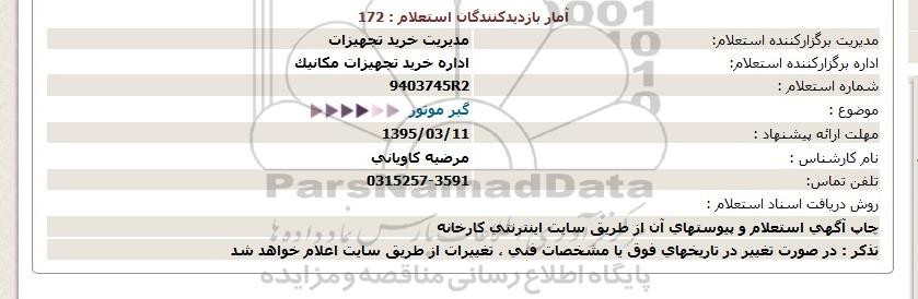 استعلام بها و موضوع استعلام استعلام,استعلام گیر موتور به اطلاع کلیه شرکتها و افراد متخصص واجد شرایط میرساند، آگهی گذار در نظر دارد از طریق استعلام بها، نسبت به انتخاب و دریافت پیشنهادات اقدام نماید. این استعلام با کد آگهی ثبت شده در سامانه خبرگزاری پارس نماد : 671876 منتشر شده است. مشخصات استعلام : تاریخ شروع استعلام: 1395/03/10 آخرین مهلت ارسال پیشنهاد قیمت : 1395/03/11 و محل اجرای پروژه : استان اصفهان میباشد. استعلام قیمت مورد درخواست : استعلام,استعلام گیر موتور با دستهبندیهای تخصصی و گروه های مرتبط : تجهیزات و ماشین آلات صنعتی, استعلام اطلاع رسانی میگردد.