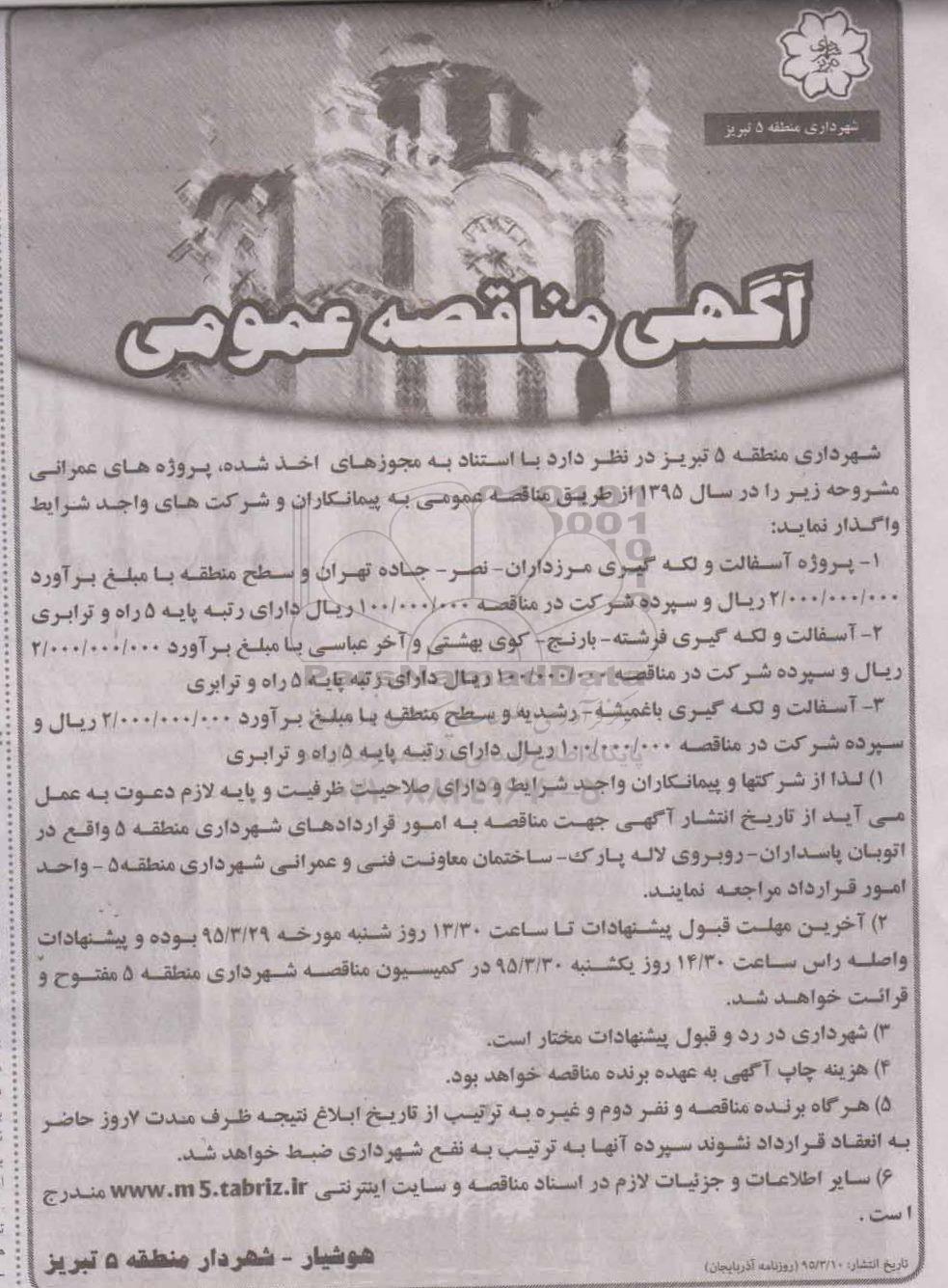 شهرداری منطقه 5 تبریز در نظر دارد باستناد مجوز اخذ شده پروژه های عمرانی مشروحه زیر را در سال 1395 از طریق مناقصه عمومی به پیمانکاران و شرکتهای واجد شرایط واگذار نماید .