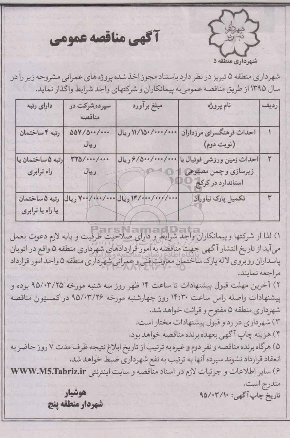 شهرداری منطقه 5 تبریز در نظر دارد به استناد مجوز اخذ شده پروژه های عمرانی مشروحه زیر را در سال 95 از طریق مناقصه عمومی به پیمانکاران و شرکتهای واجد شرایط واگذار نماید:
