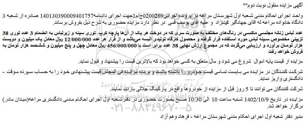مزایده در تاریخ 1402/10/9 شنبه ساعت 10 الی 10:30 صبح بصورت حضوری در دفترشعبه اول اجرای احکام مدنی دادگستری مراغه(میدان مادر) برگزار خواهد شد.