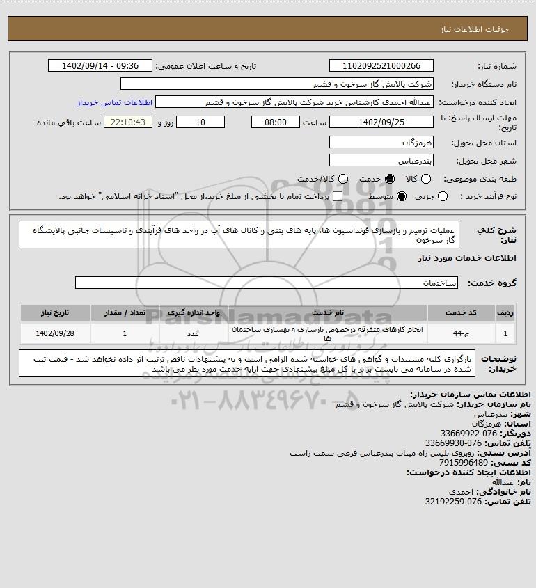 شرح کلی نیاز: عملیات ترمیم و بازسازی فونداسیون ها، پایه های بتنی و کانال های آب در واحد های فرآیندی و تاسیسات جانبی پالایشگاه گاز سرخون