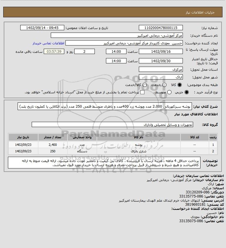 شرح کلی نیاز: پوشه سبزکهربائی 2.000 عدد وپوشه زرد 400عدد و باطری متوسط قلمی 250 عدد (برند الکالاین یا کملیون تاریخ بلند)