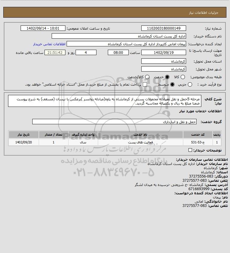 شرح کلی نیاز: مرحله 5حمل و نقل ومبادله محمولات پستی از کرمانشاه به پاوه(مبادله روانسر )برعکس با نیسان (مسقف) به شرح پیوست ضمنا مبلغ به ریال و یکساله محاسبه گردید.