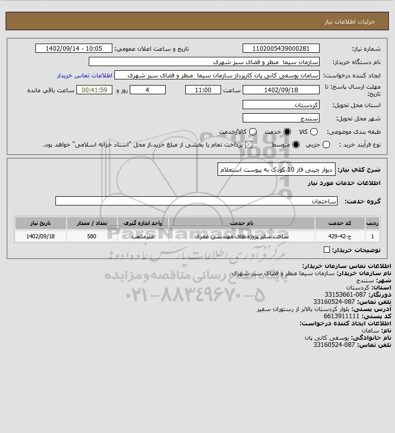 شرح کلی نیاز: دیوار چینی فاز 10 کودک به پیوست استعلام