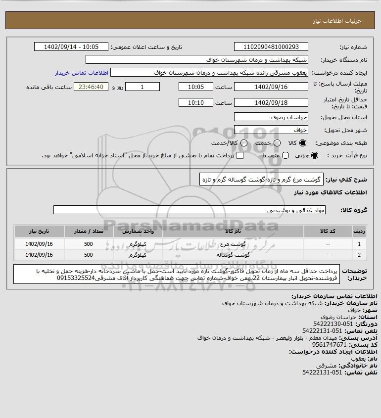 | 1 | -- | گوشت مرغ | کیلوگرم | 500 | 1402/09/16 |