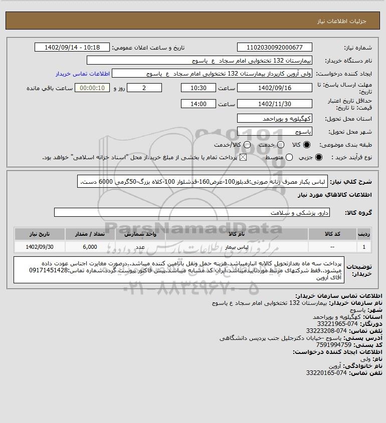 | 1 | -- | لباس بیمار | عدد | 6,000 | 1402/09/30 |