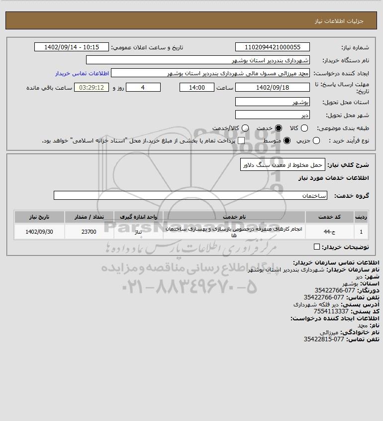 شرح کلی نیاز: حمل مخلوط از معدن سنگ دلاور