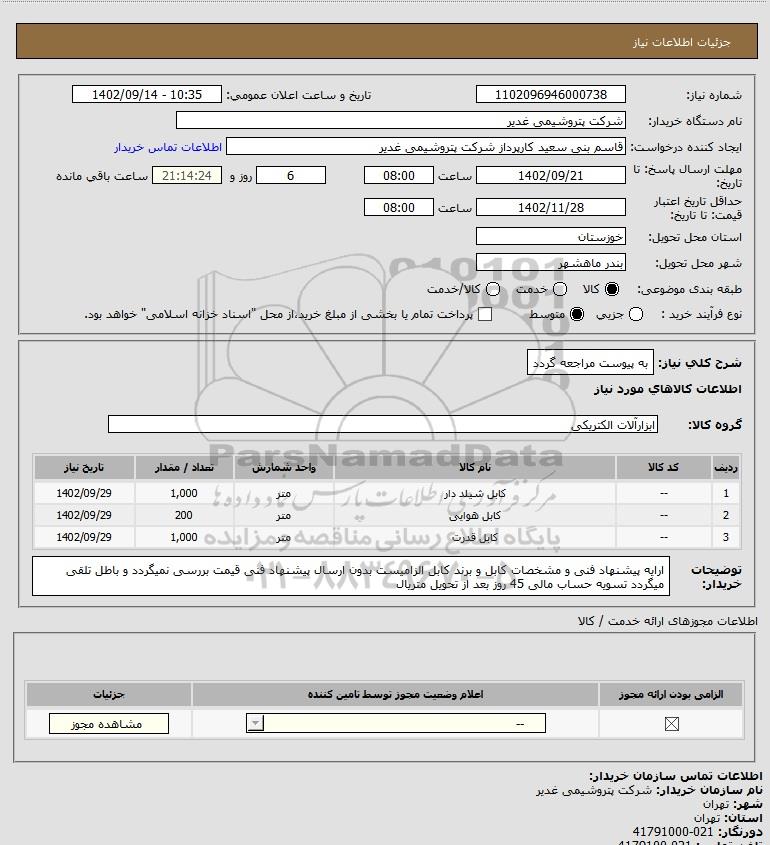 | 3 | -- | کابل قدرت | متر | 1,000 | 1402/09/29 |