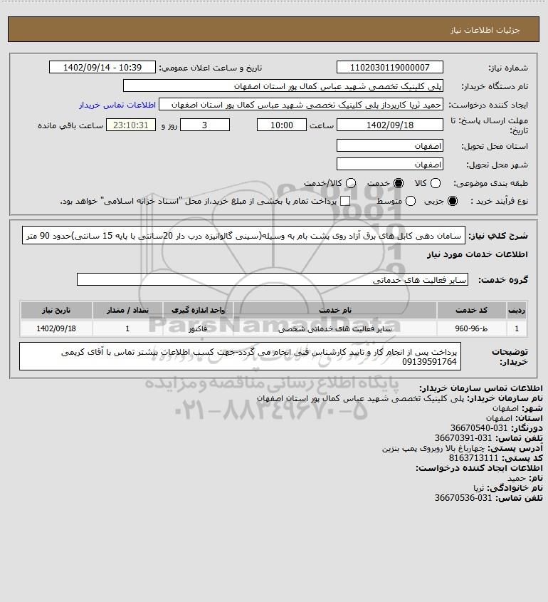 شرح کلی نیاز: سامان دهی کابل های برق آزاد روی پشت بام به وسیله(سینی گالوانیزه درب دار 20سانتی با پایه 15 سانتی)حدود 90 متر