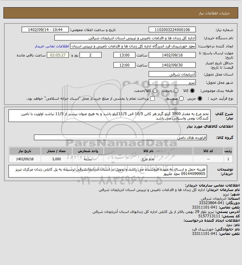 شرح کلی نیاز: تخم مرغ به مقدار 3000 کیلو گرم هر کاتن 10/5 الی 11/5کیلو باشد و به هیج عنوان بیشتر از 11/5 نباشد اولویت با تامین کنندگان بومی واستانی می باشد