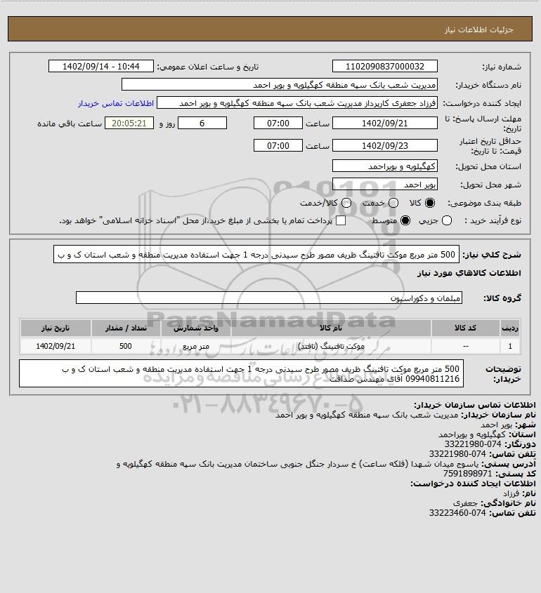 | 1 | -- | موکت تافتینگ (تافتد) | متر مربع | 500 | 1402/09/21 |