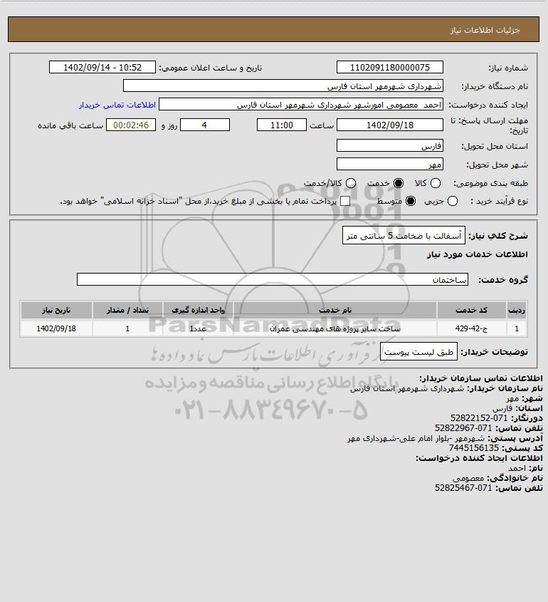 شرح کلی نیاز: آسفالت با ضخامت 5 سانتی متر