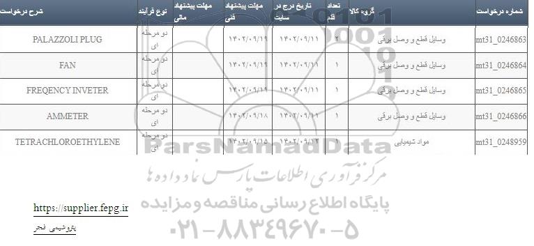 | شماره درخواست | گروه کالا | تعداد قلم | مهلت پیشنهاد فنی | نوع فرآیند | شرح درخواست |