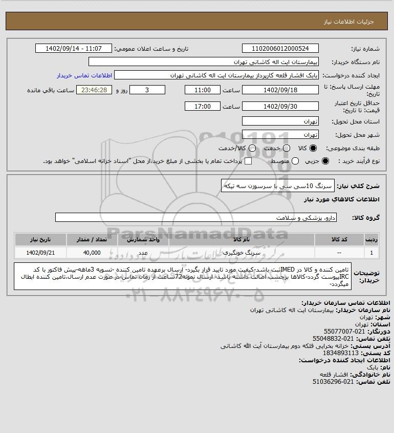 | 1 | -- | سرنگ خونگیری | عدد | 40,000 | 1402/09/21 |