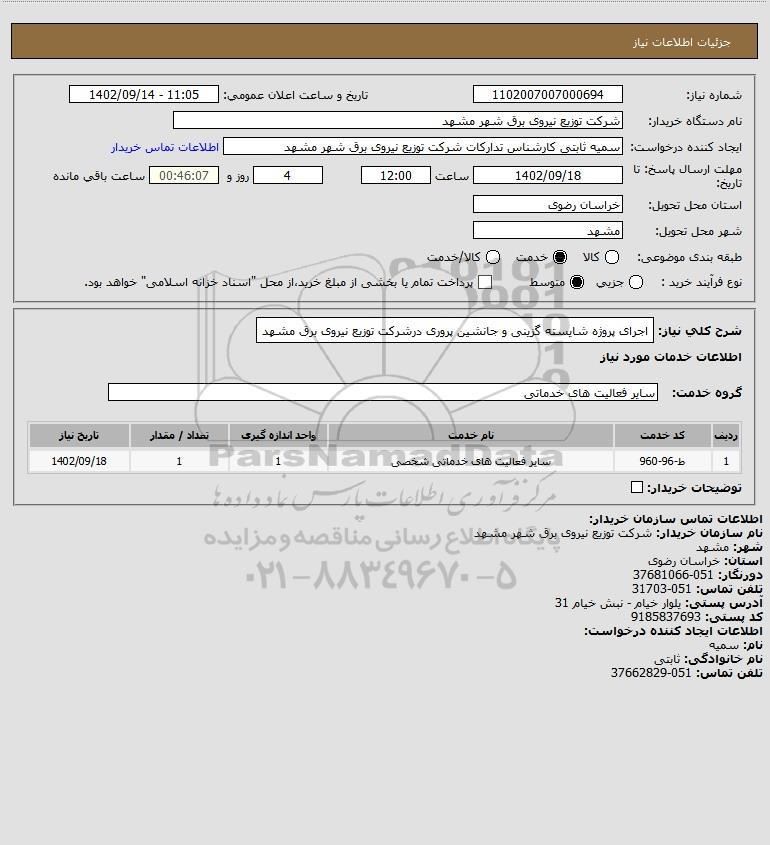 نام سازمان خریدار: شرکت توزیع نیروی برق شهر مشهد