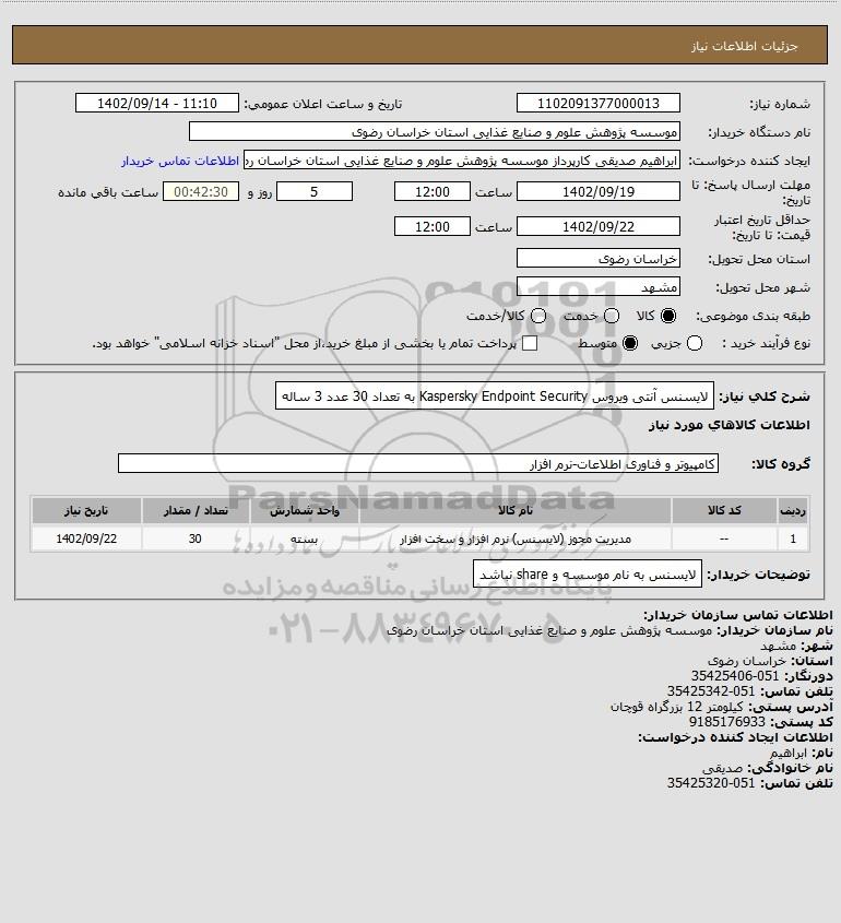 شرح کلی نیاز: لایسنس آنتی ویروس Kaspersky Endpoint Security به تعداد 30 عدد 3 ساله