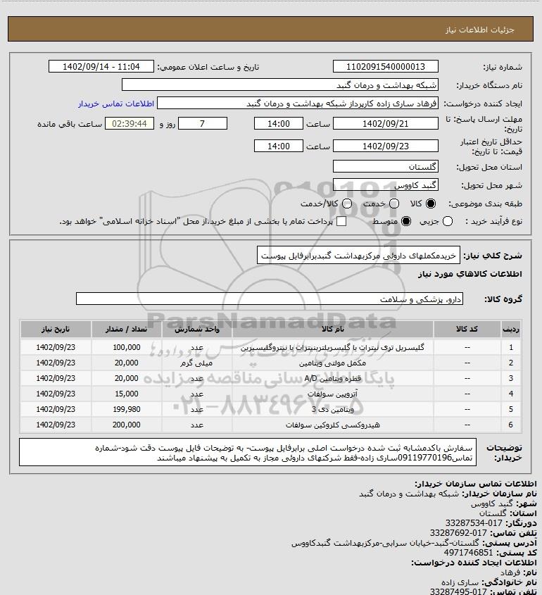 شرح کلی نیاز: خریدمکملهای داروئی مرکزبهداشت گنبدبرابرفایل پیوست
