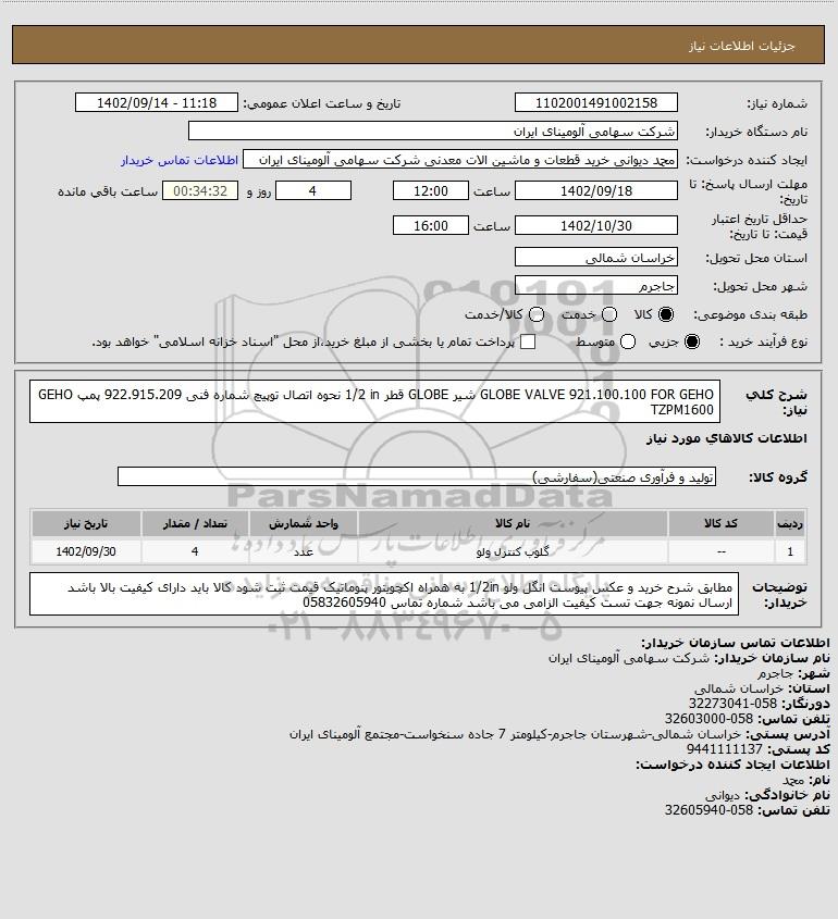 شرح کلی نیاز: GLOBE VALVE 921.100.100 FOR GEHO شیر ‎GLOBE‏‏ قطر ‎1/2 in‏ نحوه اتصال ‎توپیچ‏ شماره فنی ‎922.915.209 پمپ GEHO TZPM1600