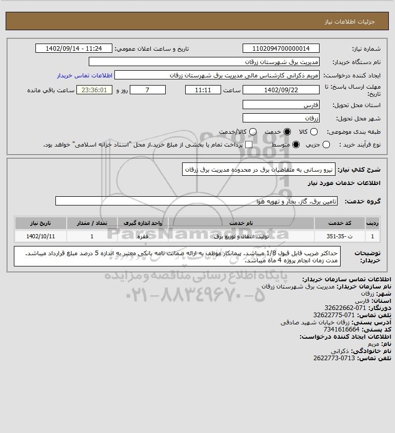 نام دستگاه خریدار:مدیریت برق شهرستان زرقان