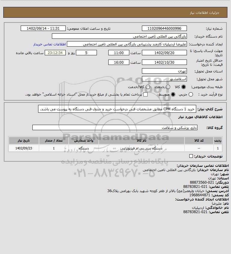 | 1 | -- | دستگاه سی پی ام فیزیوتراپی | دستگاه | 1 | 1402/09/23 |