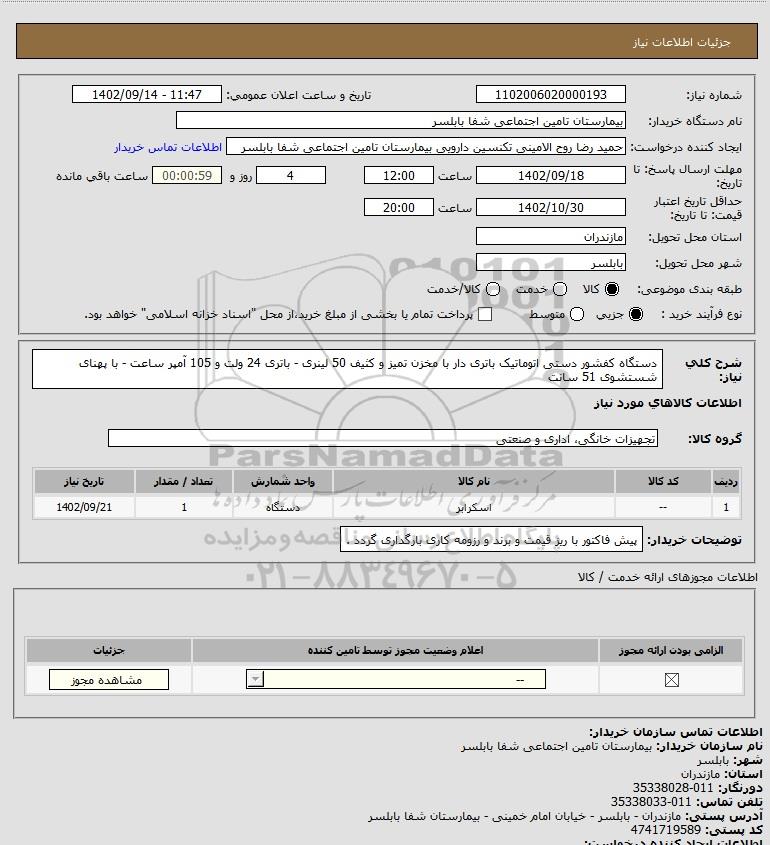 نام دستگاه خریدار:بیمارستان تامین اجتماعی شفا بابلسر