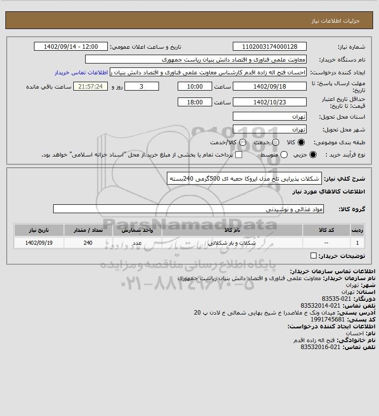 | 1 | -- | شکلات و بار شکلاتی | عدد | 240 | 1402/09/19 |