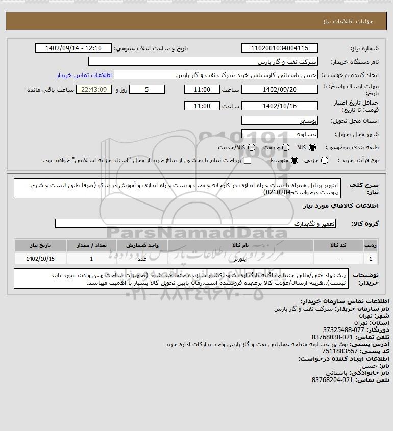 شرح کلی نیاز: اینورتر پرتابل همراه با تست و راه اندازی در کارخانه و نصب و تست و راه اندازی و آموزش در سکو (صرفا طبق لیست و شرح پیوست درخواست-0210284)