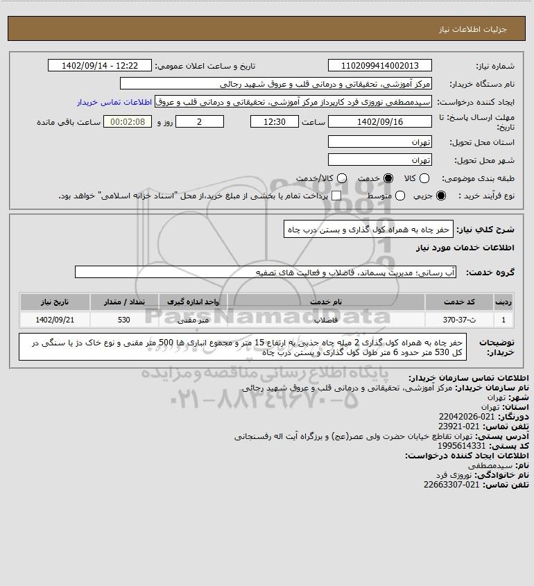 شرح کلی نیاز: حفر چاه به همراه کول گذاری و بستن درب چاه