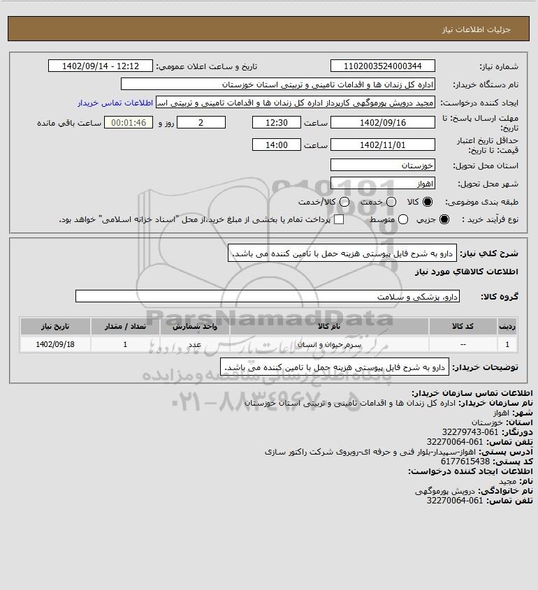 شرح کلی نیاز: دارو به شرح فایل پیوستی هزینه حمل با تامین کننده می باشد.