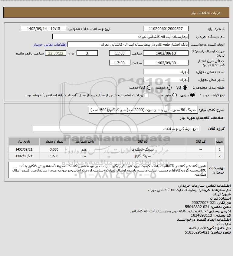 شرح کلی نیاز: سرنگ 50 سی سی با سرسوزن (3000عدد)-سرنگ گاواژ(1500عدد)