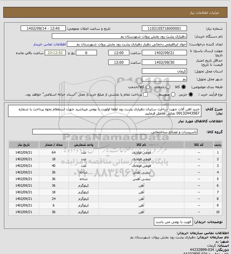 شرح کلی نیاز: خرید اهن آلات جهت ساخت سایبان دهیاری پشت رود لطفا اولویت با بومی میباشید جهت استعلام نحوه پرداخت با شماره 09132443567 تماس حاصل فرمایید