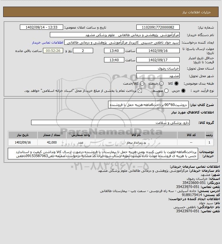 | 1 | -- | پد زیرانداز بیمار | عدد | 42,000 | 1402/09/16 |