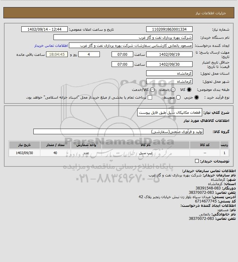 شرح کلی نیاز: قطعات مکانیکال سیل طبق فایل پیوست