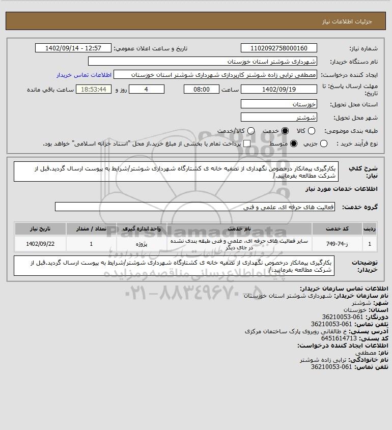 شرح کلی نیاز: بکارگیری پیمانکار درخصوص نگهداری از تصفیه خانه ی کشتارگاه شهرداری شوشتر/شرایط به پیوست ارسال گردید.قبل از شرکت مطالعه بفرمایید./