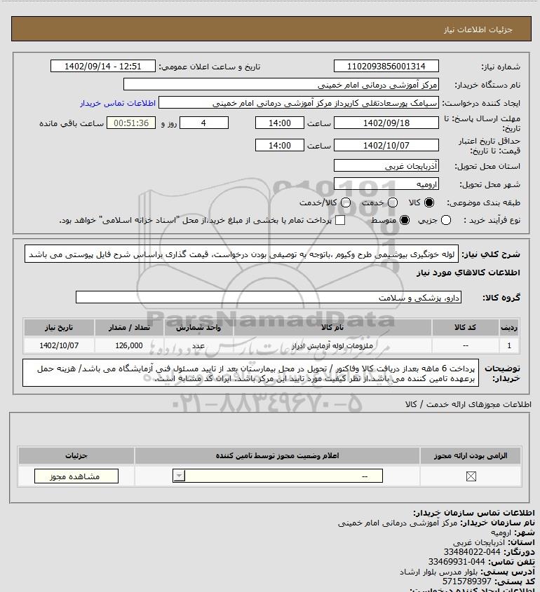 1 -- ملزومات لوله آزمایش ادرار عدد 126,000 1402/10/07