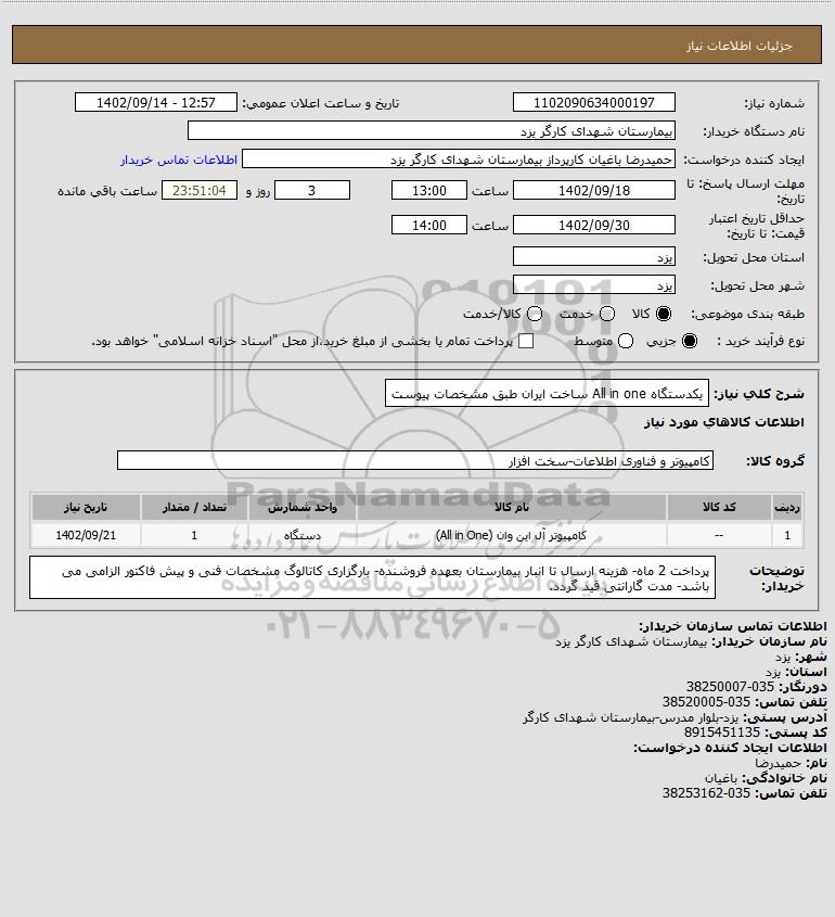 شرح کلی نیاز: یکدستگاه All in one ساخت ایران طبق مشخصات پیوست