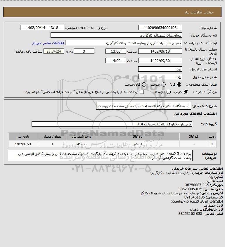 شرح کلی نیاز: یکدستگاه اسکنر حرفه ای ساخت ایران طبق مشخصات پیوست
