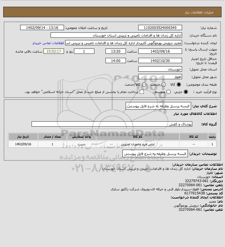 شرح کلی نیاز: البسه پرسنل وظیفه به شرح فایل پیوستی