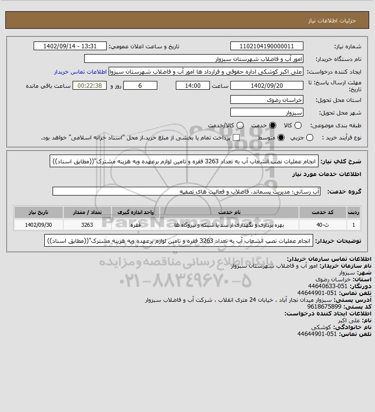 توضیحات خریدار:انجام عملیات نصب انشعاب آب به تعداد 3263 فقره و تامین لوازم برعهده وبه هزینه مشترک"((مطابق اسناد))