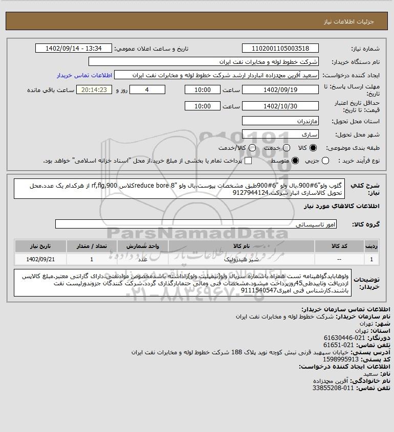استعلام گلوب ولو"6#900،بال ولو "6#900طبق مشخصات پیوست،بال ولو "8 reduce boreکلاس 900,rf,flg از هرکدام یک عدد.محل تحویل کالاساری انبار شرکت.9127944124, استعلام گلوب ولو"6#900،بال ولو "6#900طبق مشخصات پیوست،بال ولو "8 reduce boreکلاس 900,rf,flg از هرکدام یک عدد.محل تحویل کالاساری انبار شرکت.9127944124