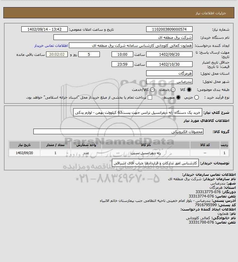 استعلام خرید یک دستگاه رله دیفرانسیل ترانس جهت پست63 کیلوولت بهمن - لوازم یدکی, استعلام خرید یک دستگاه رله دیفرانسیل ترانس جهت پست63 کیلوولت بهمن - لوازم یدکی