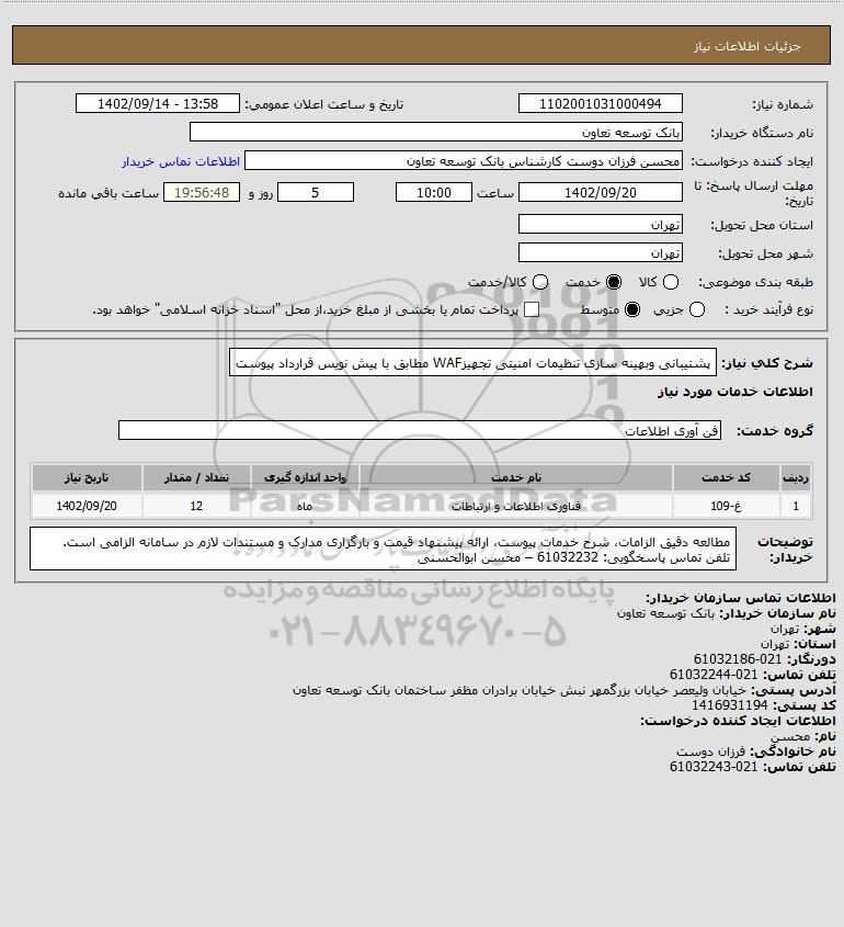 شرح کلی نیاز: پشتیبانی وبهینه سازی تنظیمات امنیتی تجهیزWAF مطابق با پیش نویس قرارداد پیوست