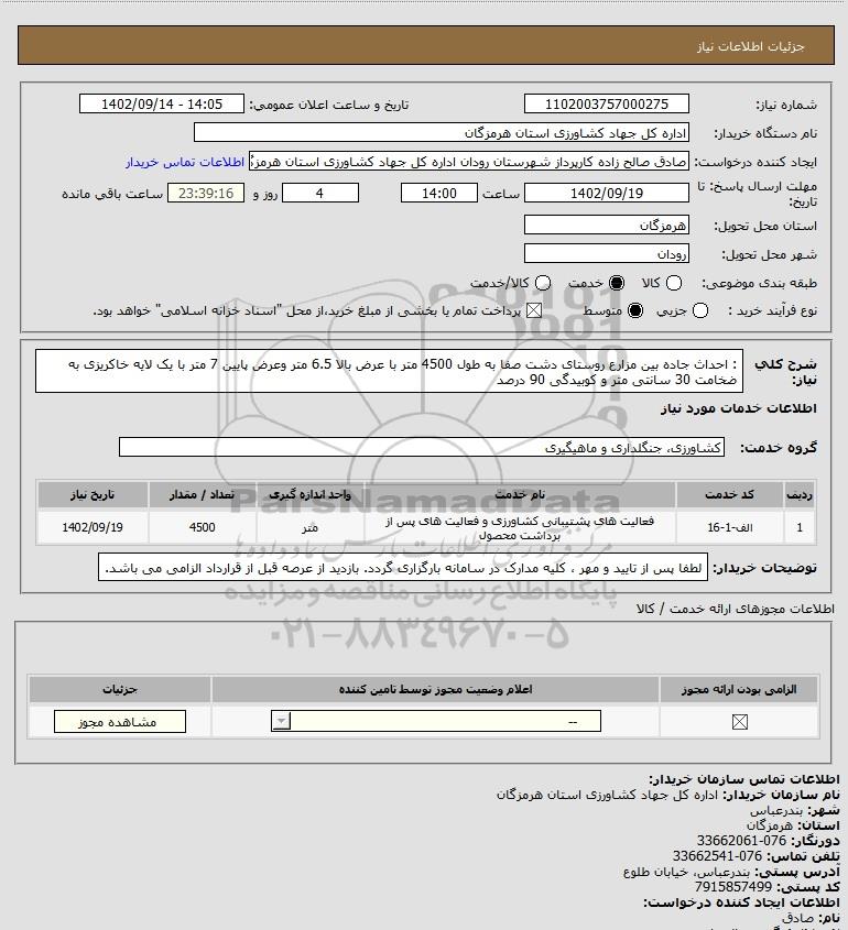 شرح کلی نیاز: : احداث جاده بین مزارع روستای دشت صفا به طول 4500 متر با عرض بالا 6.5 متر وعرض پایین 7 متر با یک لایه خاکریزی به ضخامت 30 سانتی متر و کوبیدگی 90 درصد