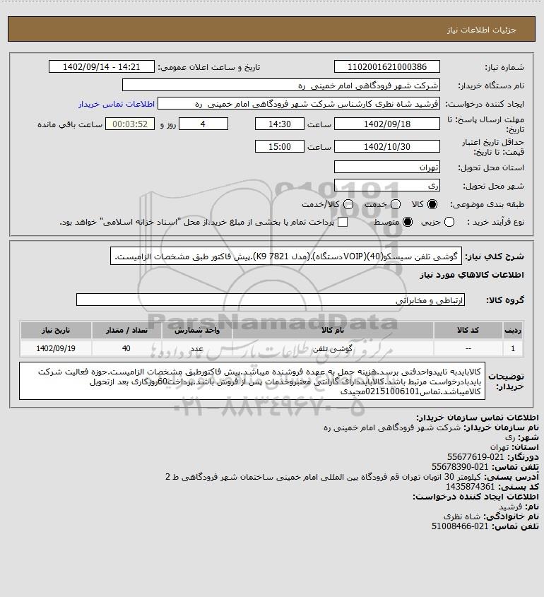 شرح کلی نیاز: گوشی تلفن سیسکو(VOIP)(40دستگاه).(مدل 7821 K9).پیش فاکتور طبق مشخصات الزامیست.