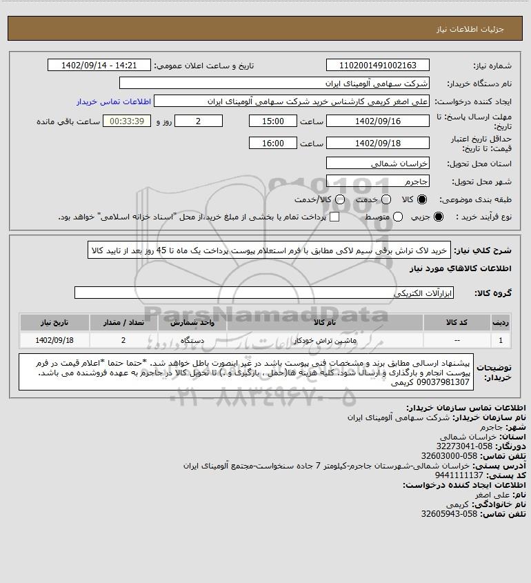 شرح کلی نیاز: خرید لاک تراش برقی سیم لاکی مطابق با فرم استعلام پیوست