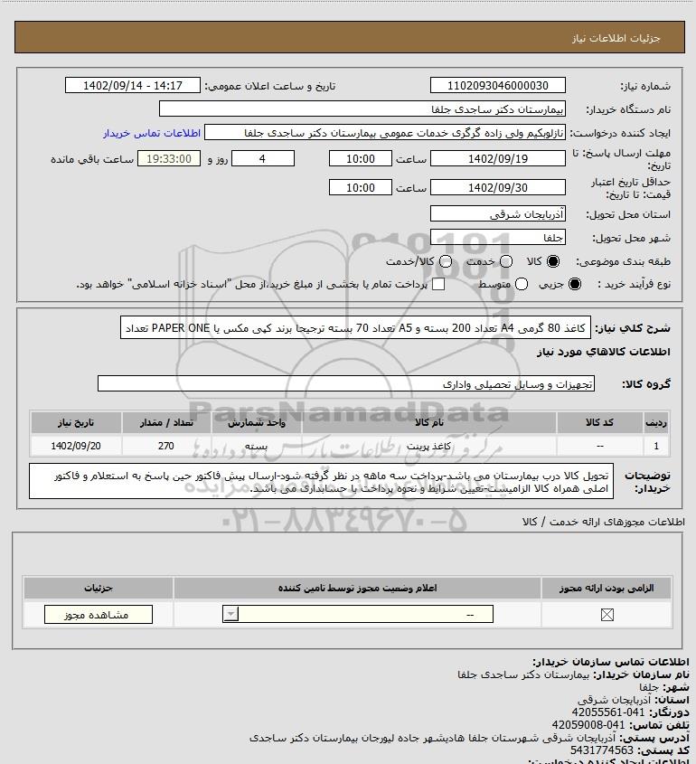شرح کلی نیاز: کاغذ 80 گرمی A4 تعداد 200 بسته و A5 تعداد 70 بسته ترجیحا برند کپی مکس یا PAPER ONE