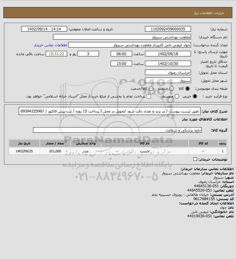 نام دستگاه خریدار:معاونت بهداشتی سبزوار